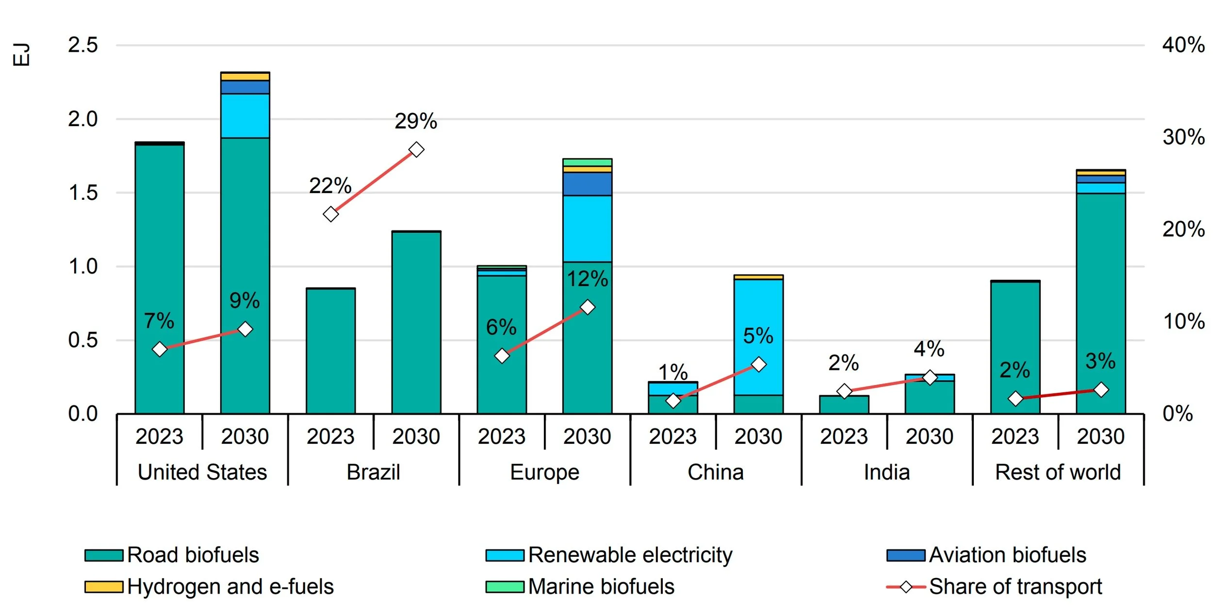 Figure 1. Renewable Fuel Demand by Region and Transport Subsector, Main Case 2023-2030
