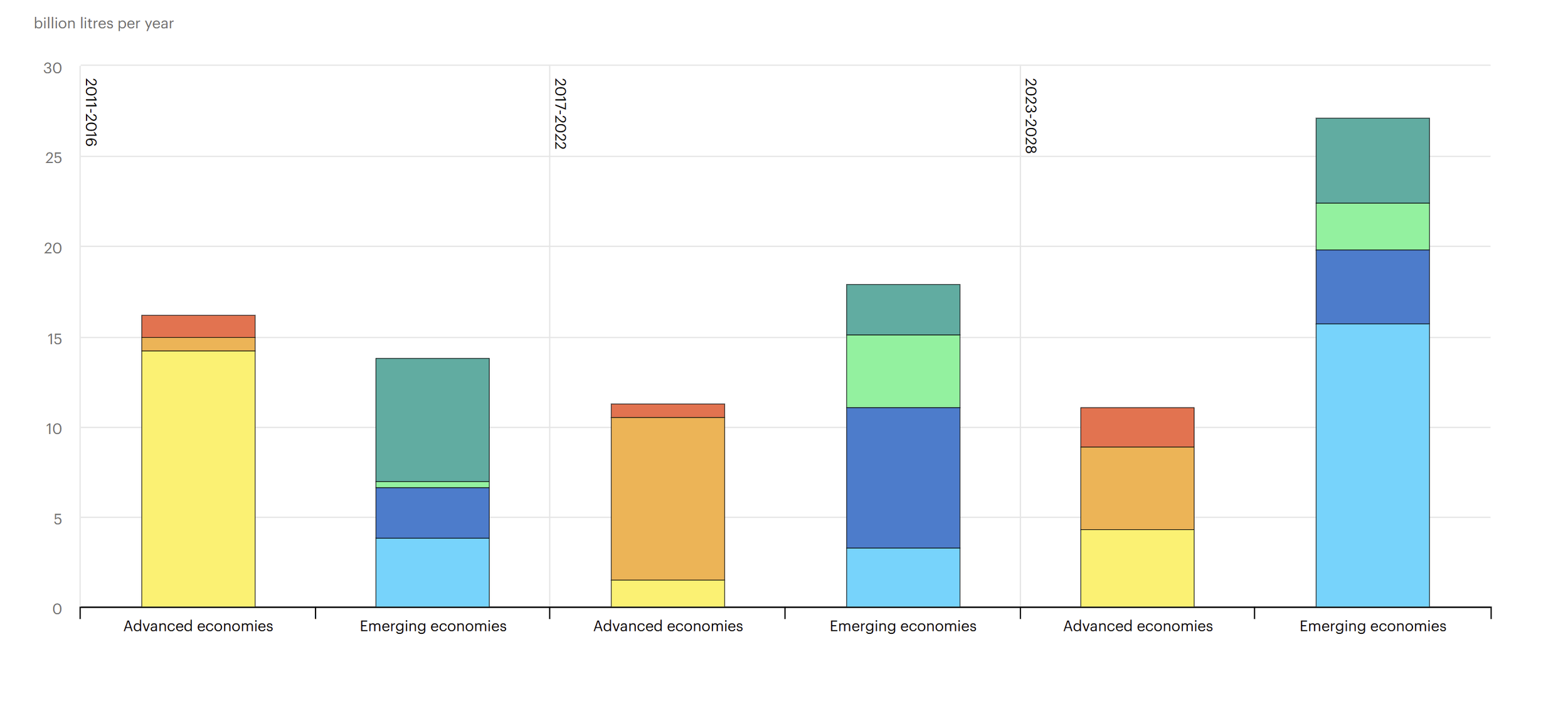 Source: International Energy Agency, “Five-year biofuel demand growth for advanced and emerging economies, main case, 2011-2028,” International Energy Agency, 2024. License: CC BY 4.0.