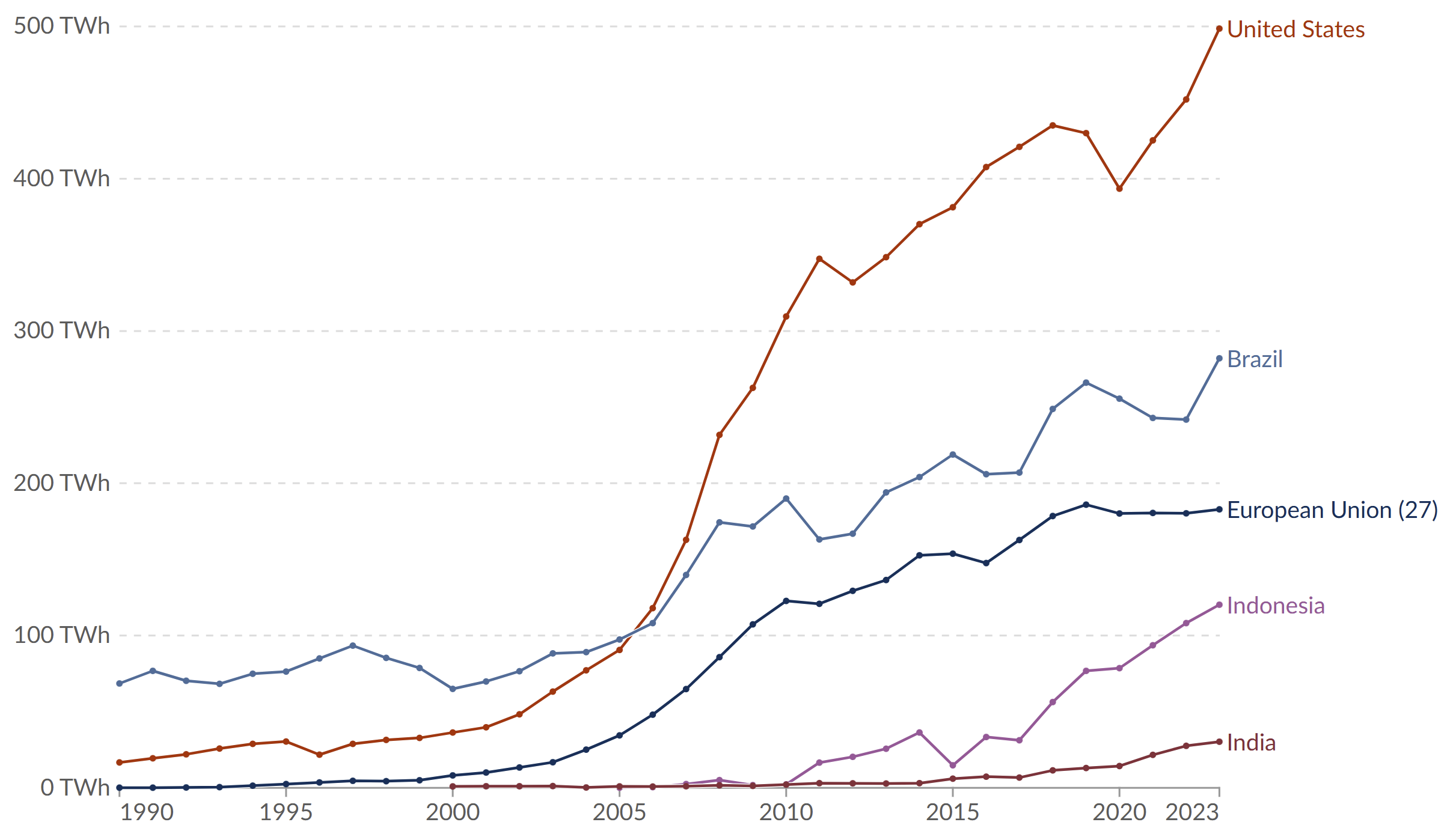 Source: Our World in Data, “Biofuels Production,” Our World in Data. License: CC BY. Notes: Total biofuel production per year is measured in terawatt-hours (TWh). Biofuel production includes both bioethanol and biodiesel.