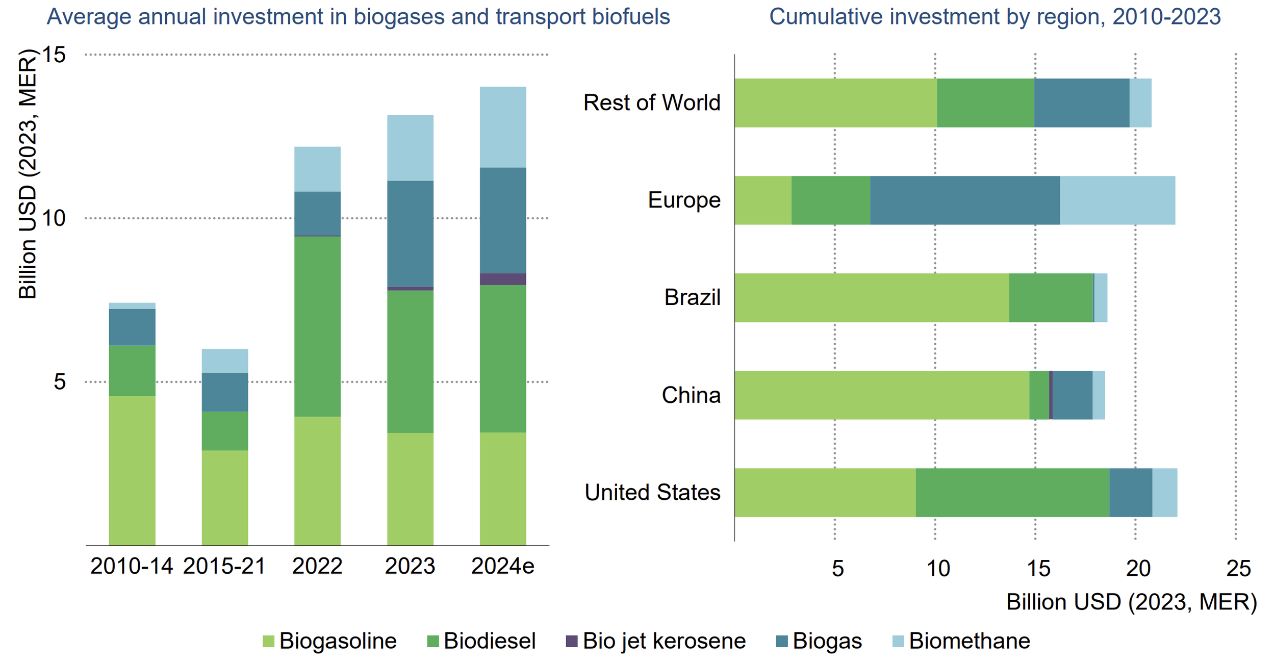 Private sector investments have also played an essential role in advancing the global biofuels industry. In 2023, the net amount of power generated by transport biofuels increased to a decade-high level, attributed to an 8 percent rise in investment. Although several traditional biofuel projects have been announced recently, such as Brazil’s Grupo Potential investing $109 million to increase its annual biodiesel production capacity from 900 million to 1.62 billion liters, most new investments in the biofuels sector are now directed toward expanding the production of so-called drop-in fuels. These include renewable diesel (HVO), biojet, and biomethane, which are chemically similar or identical to the fossil fuels they replace and can be used without engine or infrastructure modifications. In contrast, bioethanol, biodiesel, and biogas generally require blending or equipment adjustments and thus are not considered true drop-in fuels. For example, Raízen, Brazil’s largest sugar and ethanol producer, recently unveiled plans to invest R$11.5 ($2) billion in constructing nine second-generation ethanol (E2G), biogas, and biomethane plants across the country, of which only biomethane would be classified as a drop-in fuel.
