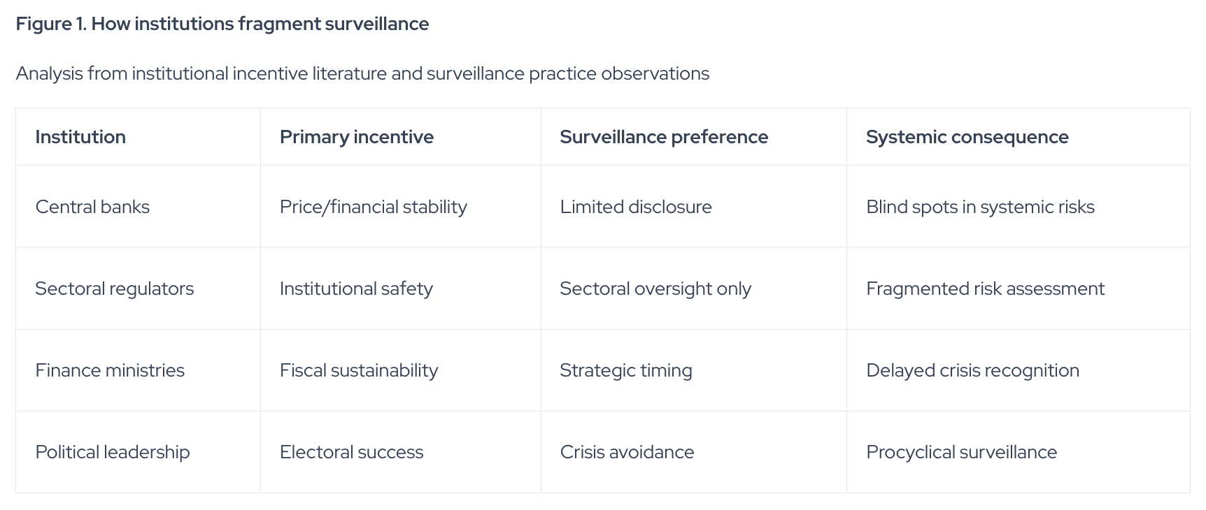 Macrofinancial surveillance – specifically monitoring the interconnections between the financial system and the broader macroeconomy (fiscal, monetary, real economy linkages) – consistently breaks down despite massive institutional investment. Most economies operate for years without systematic macrofinancial evaluation, particularly when risks are accelerating. Crucially, no country has developed a comprehensive system to monitor fiscal-financial-real economy interactions systematically – existing frameworks focus on financial stability within the financial sector, rather than on cross-sectoral linkages.
